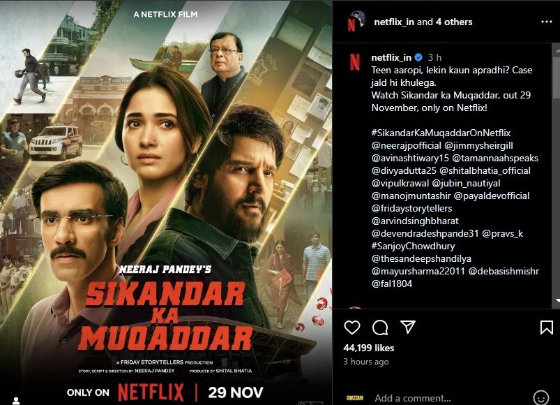 The much-anticipated Netflix film Sikandar Ka Muqaddar, featuring powerhouse performers Tamannaah Bhatia, Jimmy Shergill, and Avinash Tiwary, is set to hit the streaming platform soon. Directed by acclaimed filmmaker Neeraj Pandey, the thriller is creating a buzz across social media as fans eagerly await its release. Netflix recently unveiled the film’s official poster, accompanied by the announcement that the film will be available for streaming on November 29, 2024.